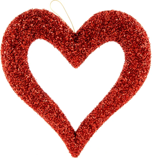 • 10” red foam heart with glitter and a fuzzy texture, featuring an open center