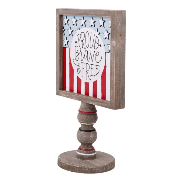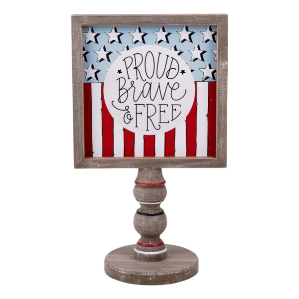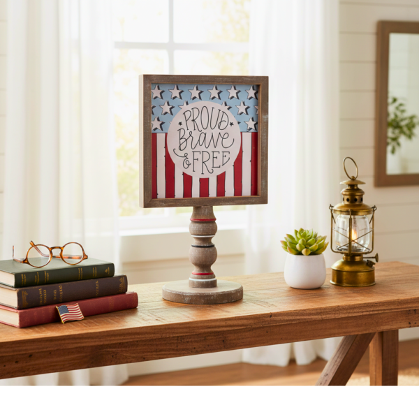 Rustic Patriotic Design: This original wood stand features a “Proud Brave & Free” message set against a classic stars and stripes background.