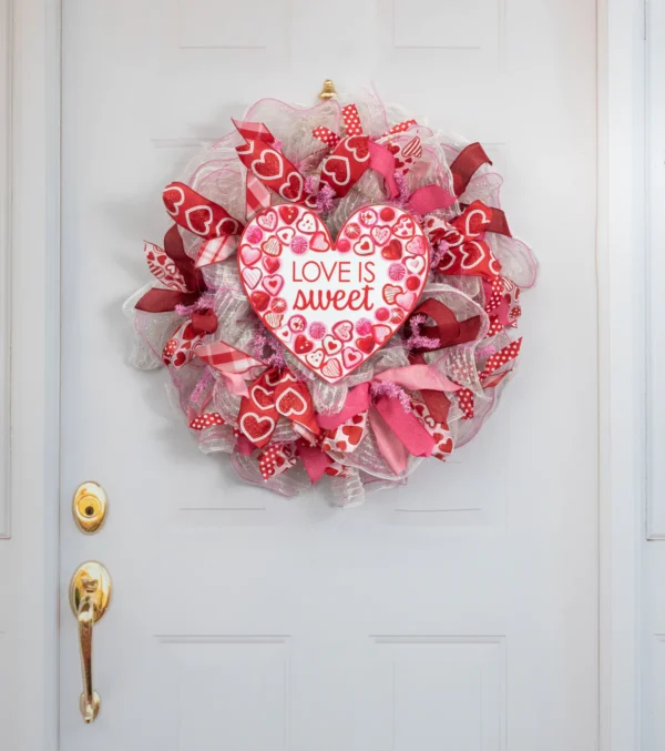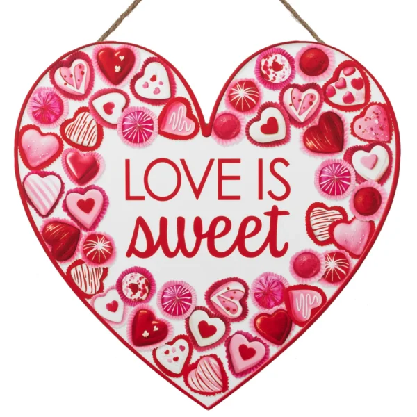 Large wooden heart sign featuring the phrase “Love Is Sweet” at the center