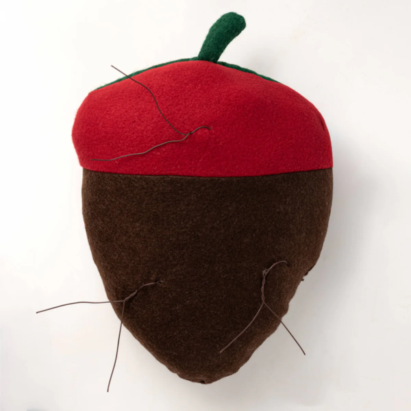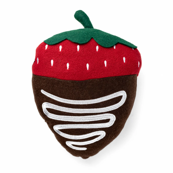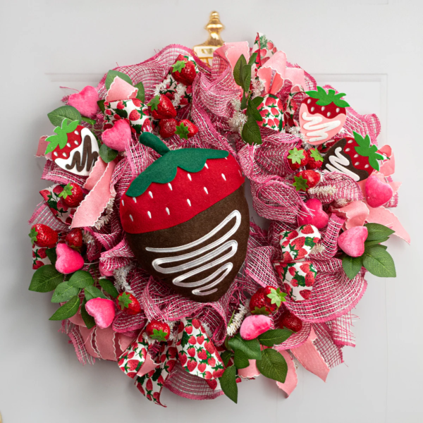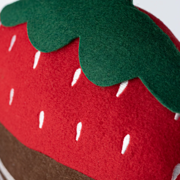Plush wreath accent features a realistic chocolate-covered strawberry design.