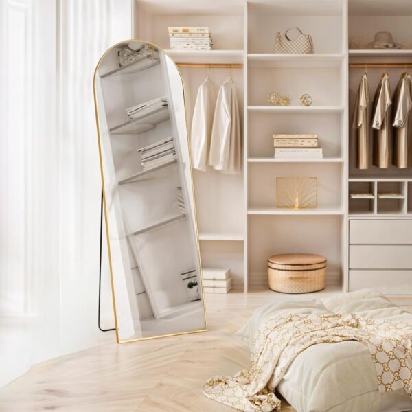 Full-Length Mirror: Available in two sizes, 64″L x 21″W or 59″L x 16″W, this standing mirror offers a full-body view, perfect for a complete outfit check. Its modern design effortlessly complements any space, with color options in black or gold to match your home décor.