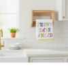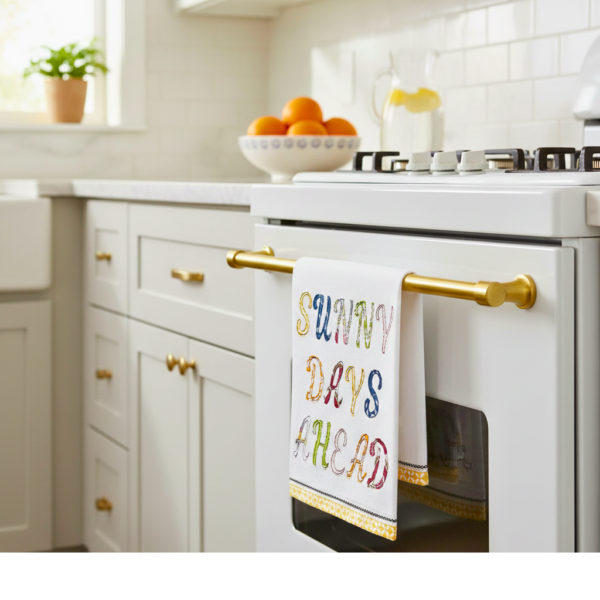 Lovely tea towel! The patchwork design is cheerful and the lettering adds a cute, sunny touch to my kitchen. The fabric feels soft and durable.