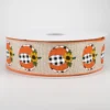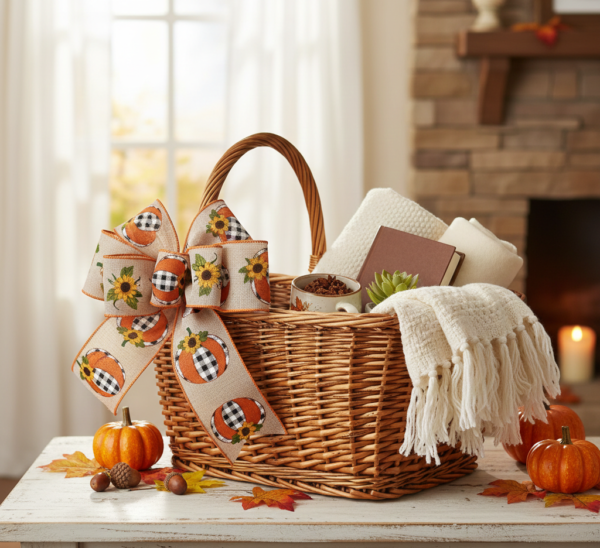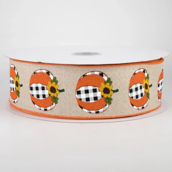 Beige linen-style ribbon featuring pumpkins topped with sunflowers and decorated with black-and-white gingham check