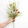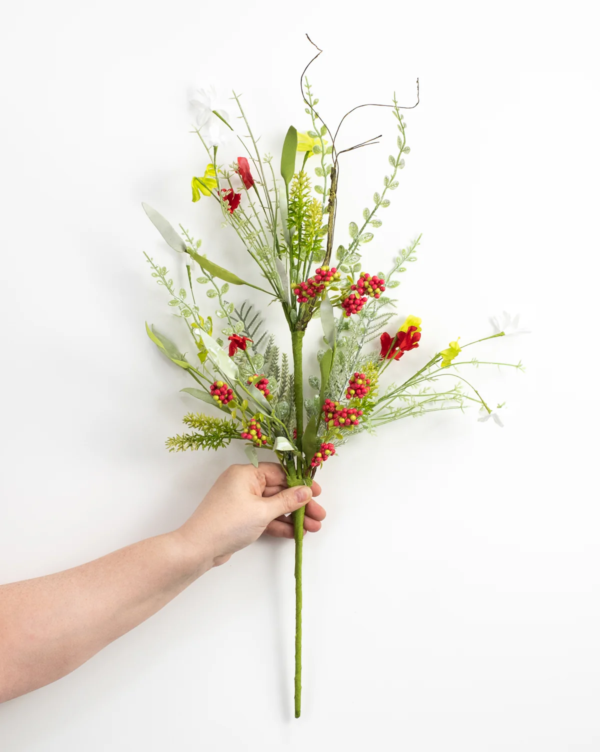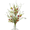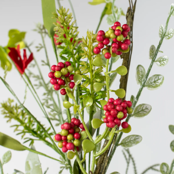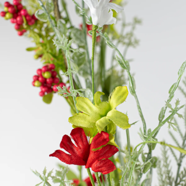 • Features silk red, white, and green flowers with foam berries and seeds.