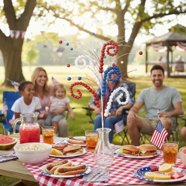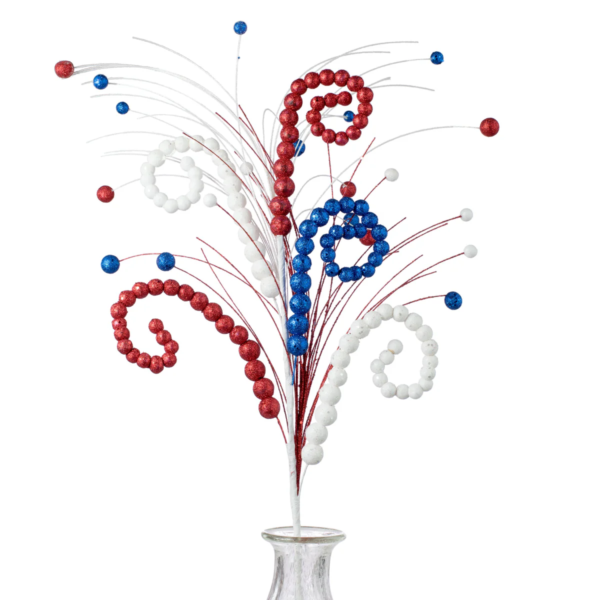 Patriotic floral pick features glitter ball swirls for bold, festive style.