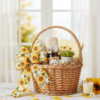 White linen-textured ribbon featuring bright sunflowers with dark centers and silvery-green eucalyptus sprigs