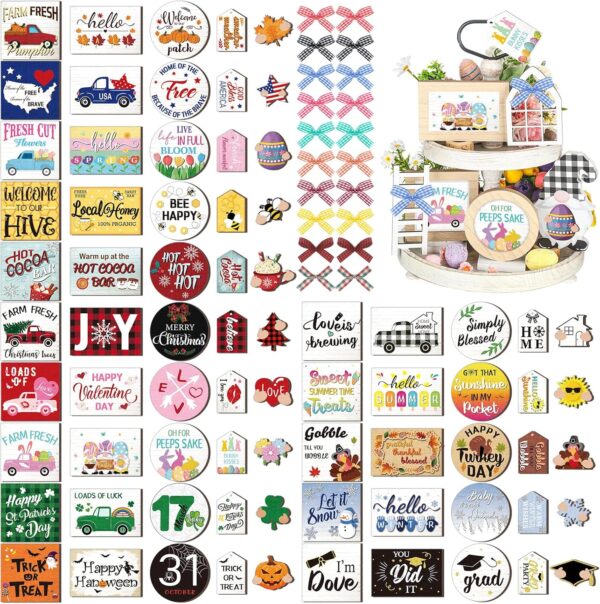 • Packaging Content: you will receive 70 pieces of interchangeable seasonal tiered tray decors set, including wooden picture frame, interchangeable saying, gnome ornament with interchangeable charm, wooden label decoration, window ornament, ladder ornament, bow, bundle of hemp rope, each piece is lovely and elegant; Sufficient quantity and variety of styles will easily meet your holiday decoration needs; Please note that trays are not included