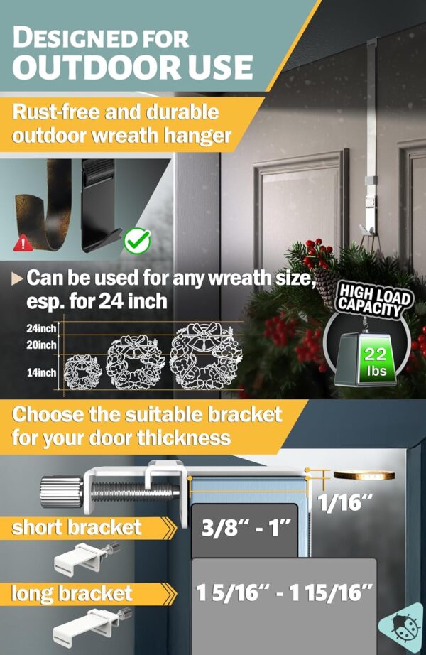 DESIGNED FOR OUTDOOR USE: Rust-free and durable outdoor wreath hanger. Reef hanger hook for front door with well-finished powder-coating. The loading weight of 22 lbs makes it suitable for 24 inch wreath