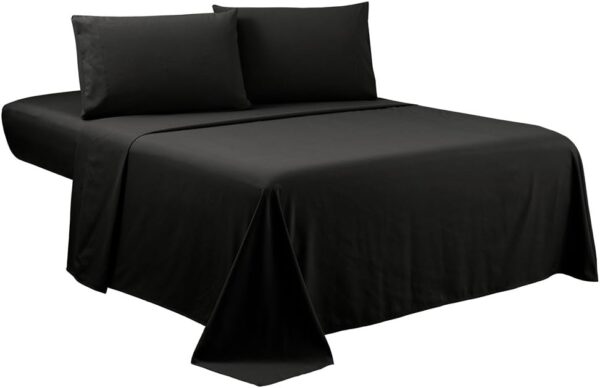 Queen Size Luxury 4pc Bed Sheets Set – 1 flat sheet 102″x90″, 1 fitted sheet 80″x60″, 2 pillowcases 20″x30″. Deep pocket fitted sheet with elastic all around (not just the corners, like other sheets). Fits mattresses up to 16″