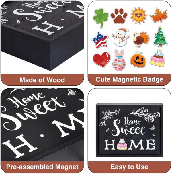 HIGH QUALITY: Our interchangeable holiday decor and detachable magnet icons are made of high quality wood, which makes it stronger and more durable, and the prints will not fade easily. Two magnetic spots make it easy to change icons and not fall off