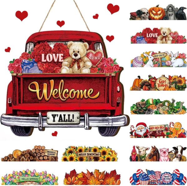 Easy to Use: our seasonal welcome signs are not only beautiful to look at, but are also versatile and easy to use; Change your front door decor instantly by swapping the seasonal decor sign on the truck, our sign for front door is easy to use and has a hidden pocket slot behind the wooden fence of the truck where you can place different cards depending on the season, and it will then be securely fastened