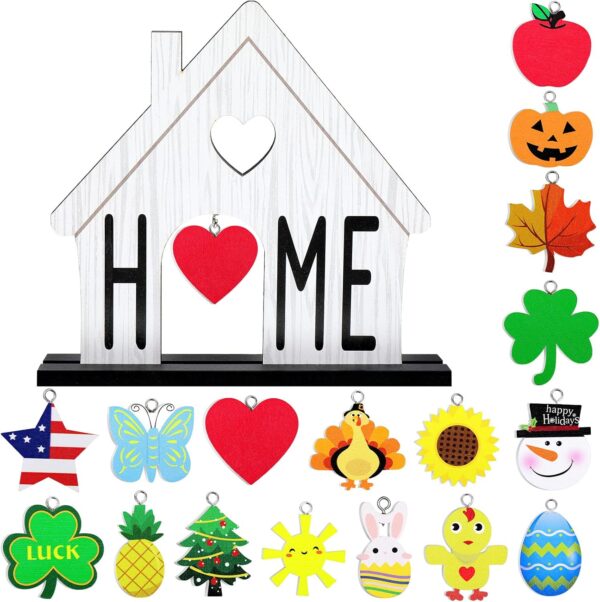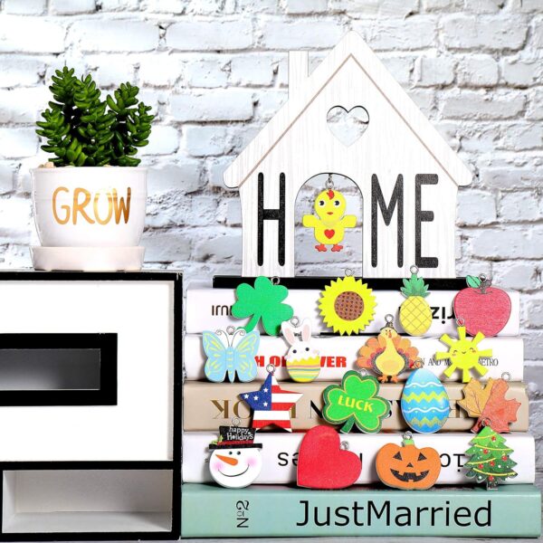 Package included: the wooden sign table decor features 17 styles of holiday pendants with star flag, love, clover, Easter chicken, maple leaf, resurrection egg, butterfly, pineapple, pumpkin, sun, snowman, Christmas tree, turkey and more, the ample and different holiday pendants will satisfy your decoration and replacement needs for different festivals