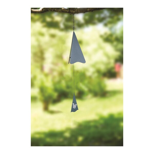 Triangle wind bell with butterfly design adds charm to any backyard.
